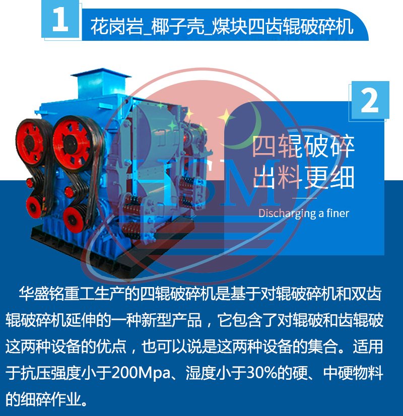【產品介紹】:華盛銘重工生產的四輥破碎機是基于對輥破碎機和雙齒輥破碎機延伸的一種新型產品,它包含了對輥破和齒輥破這兩種設備的優點,也可以說是這兩種設備的集合。本機器具有使用維修費特低、破碎比大、性能可靠、粉塵少、噪音低等特點。。